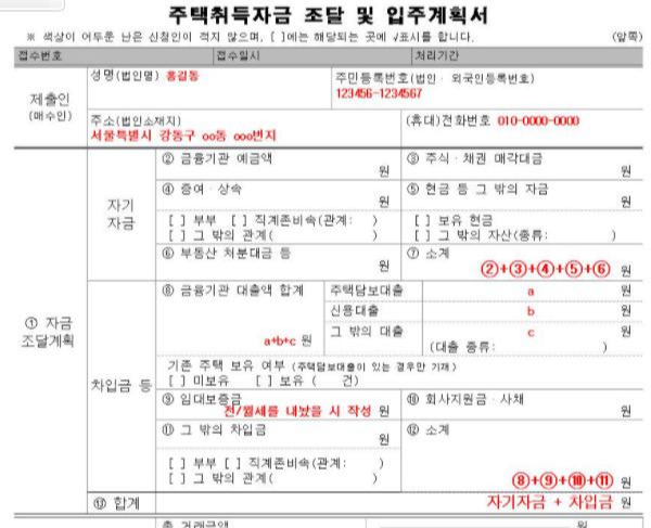 해당 문서의 경우, 거래에서 이행 된 자금을 모으는 방법에 대한 계획을 작성하고 제출할 계획입니다. 따라서 적절한 이름을 보면 일반적으로 주택 취득 자금 및 임차인 계획이라고합니다. 앞에서 언급했듯이 특정 규제 지역이나 비 규제 지역에서 6 억 명의 주택을 받으면 적어야합니다.